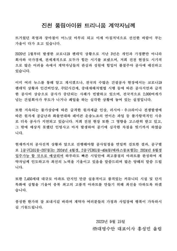 그런데 분양시 고지한 분양예정일이 불가능하니 꼼수를 부리기로 한듯하다.